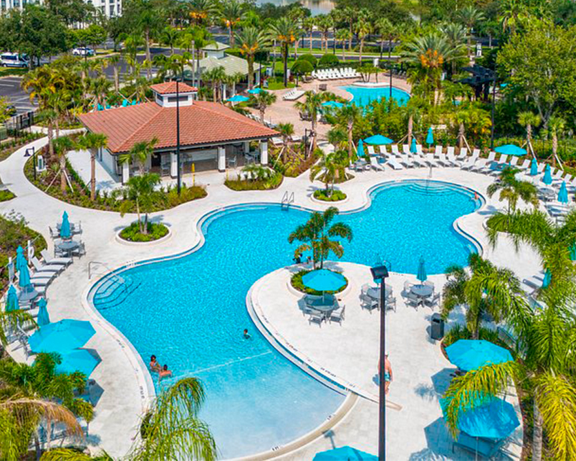 Comunidad de apartamentos de 2–3 recámaras con cocina completa, sala y lavandería, además de 2 piscinas, gimnasio, bar junto a la piscina, estacionamiento y ruta para trotar alrededor del lago. Próximo a Epic Universe (2025)